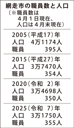 網走市の人口は減り続け、20年前と比べ1万人ほど減少している。一方、市の職員は過去10年350人前…