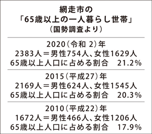 人口減少に歯止めのかからない網走市。伴って、高齢者人口は増え、一人暮らしの高齢者は2千人を超えた(…