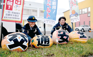美幌警察署が24日、警察署の敷地内に「交通安全」の文字を書き入れたハロウィーンカボチャを設置した。…