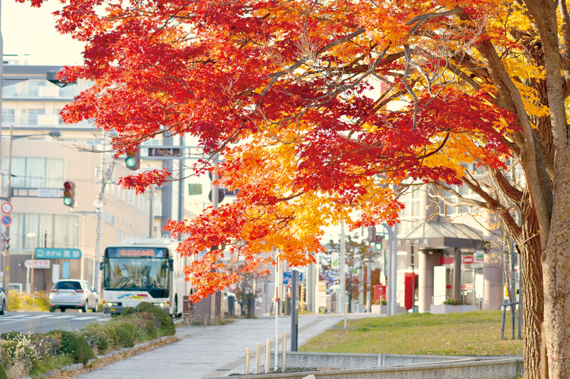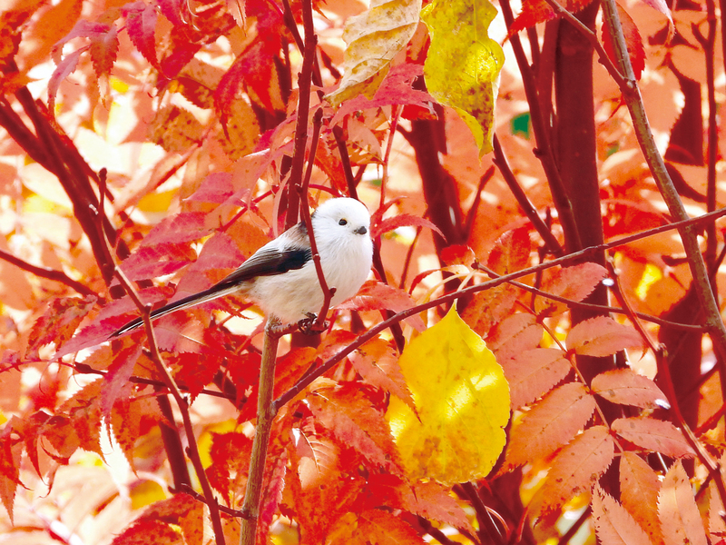 北見市内のピアソン記念館の前庭で撮影したシマエナガ。通年見ることができる野鳥だが、色付く木々を背に…