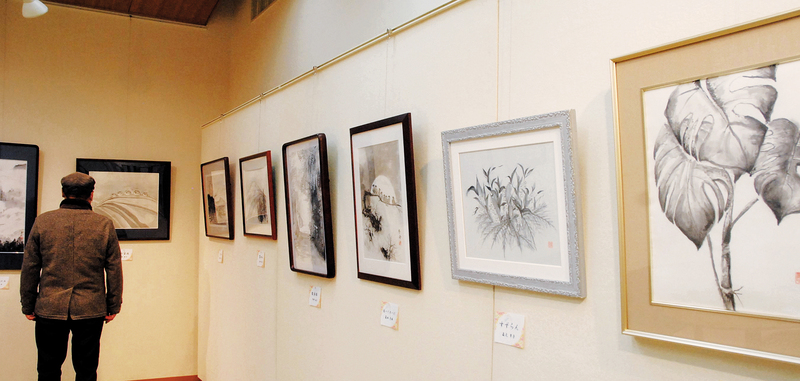北見の水墨画愛好者9人による作品展が、北見市内のNHK北見放送局内ぎゃらりーで開かれている。墨の濃…
