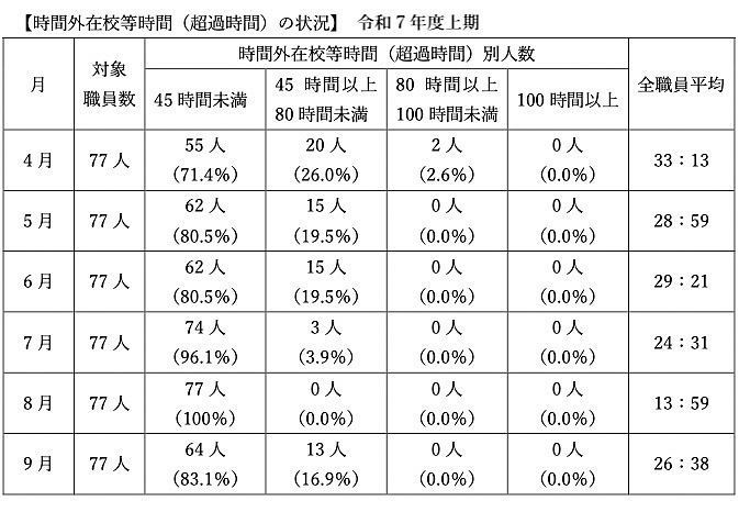 学校における働き方改革を進めている大空町教委は、2025年度上期の教職員の時間外在校時間(超過時間…