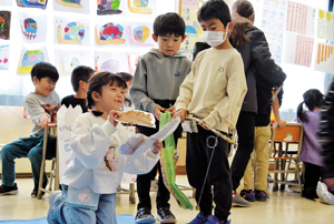 北見美山小学校で12日、1年生と近隣の保育施設に通う年長児が交流する「あきのたからものランド」が行…