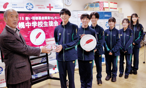 美幌中学校生徒会が18日、学校で集めた赤い羽根共同募金7867円を美幌町共同募金委員会に託した。 …