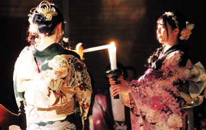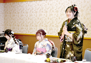 北見美容専門学校の「はたちのお祝い」が9日、北見市内のホテル黒部で開かれた。振り袖などの晴れ着に身…