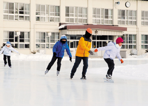 北見豊地小学校のスケートリンク開きが7日、同校グラウンドで行われた。児童達は父親らが手作りしたリン…
