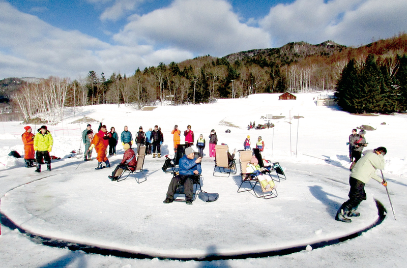 湖面に作った氷の円盤に乗ろう!と置戸町のおけと湖で17日、「アイスカルーセル」親子体験が初めて行わ…