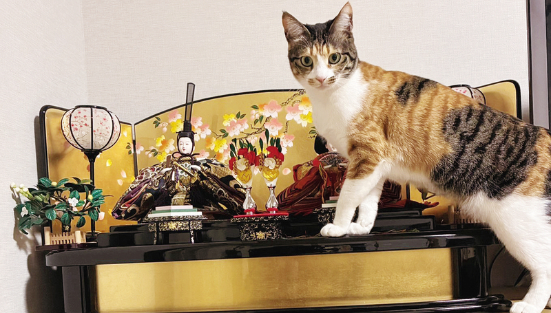 「私もお雛様」と言わんばかりに、お内裏様と並んでご満悦。三毛猫の「こぶし」は昨年6月に北見市の保護…