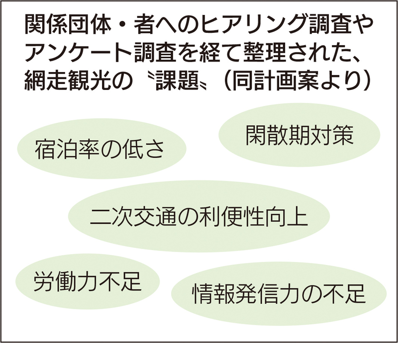 網走市が公表した、最新版の「観光振興計画2026」(案)。計画期間中の入り込み客数などの目標値を掲…