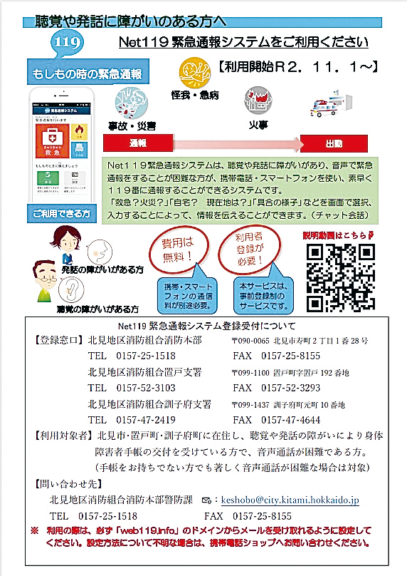 北見地区消防組合消防本部は、聴覚や発話に障がいのある人が、救急車や消防車を呼びたいときにスマートフ…