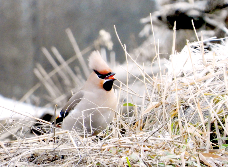 北見市北上で、冬鳥のキレンジャクの姿が見られた。枯れ草の上に止まり、冠羽を立てて周囲を見回す姿が目…
