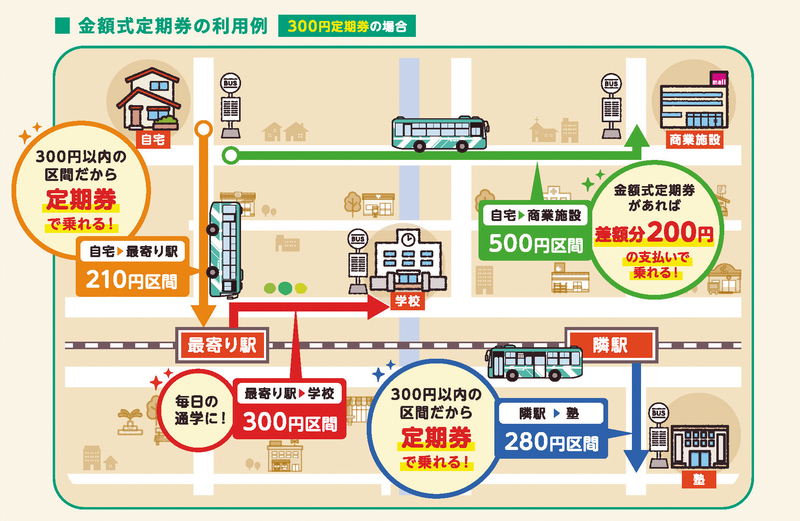 金額式定期券は、従来の区間式定期券とは異なり、購入時に設定した運賃内の区間であれば、通常の通学や通勤路線以外でもバスを自由に乗り降りできる。