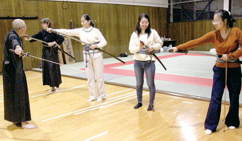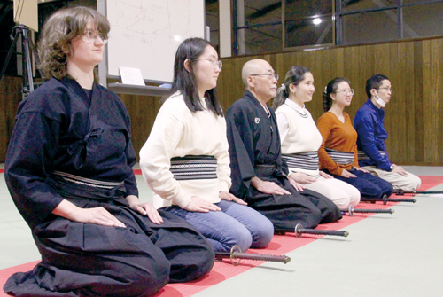 いよいよ帯を着け、模擬刀を差し、一人前の気分も、なかなか刀の抜き差しができず、苦労していた。気合を入れて道衣を持参したフィンランドからの留学生は「武道の瞑想やリラックスする時間が好きです」、モンゴルからの留学生は「武士の歴史も学べて良かった。面白かった」と感想。ひとときSAMURAI気分に浸った。 (寒)