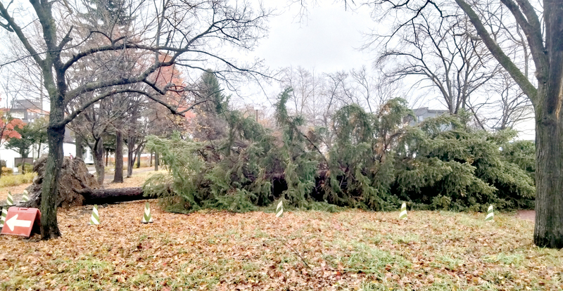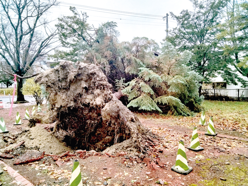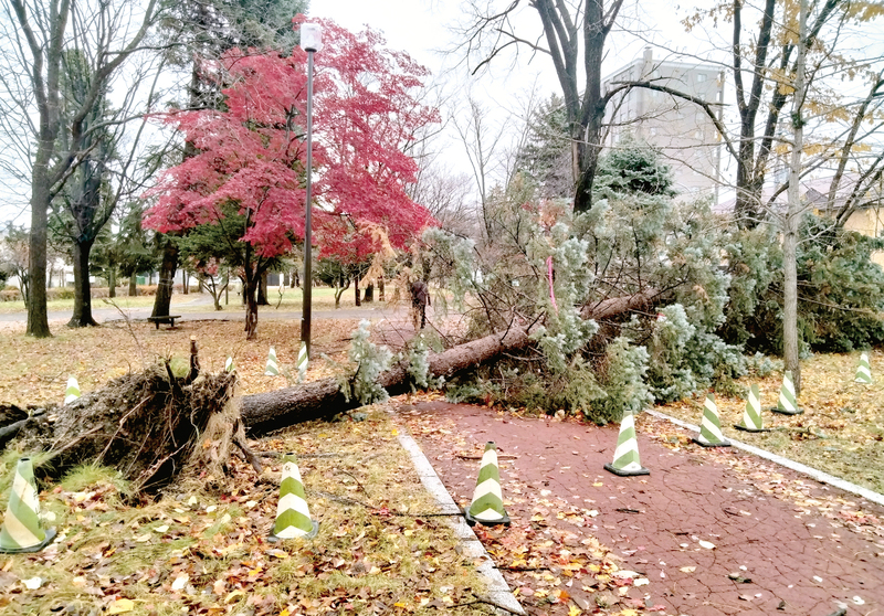 1日、北海道全域を襲った台風並みの爆弾低気圧の影響で、北見市の遊歩道「石北大通」では、プンゲンストウヒなどの針葉樹4本が倒れた。