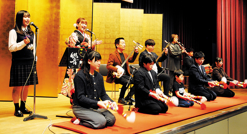 祝賀会では、それぞれの関係者が見守る中、須貝さんは北見市民謡協会と会主を務める北見民謡会「響」のメンバーとともに民謡を披露。おがわさんは、バンドの演奏に合わせて会場を回るなどしながら歌い、アンコールも飛び出すなど会場を盛り上げた。田丸さんは「北見の歴史あれこれ」の未発表のレポートから「バナナの話」を朗読。それぞれの分野で卓越した功績のある3人の発表に、出席者は大きな拍手を贈った。 (菊)