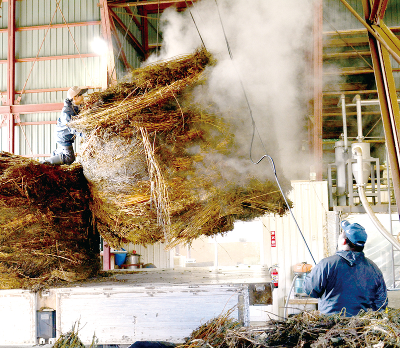 肌寒い季節に行われる晩秋の作業。釜に乾草を詰め、次の蒸留に控えて乾草を用意し、そうしている間に別の釜の蒸留が終わり、また乾草を入れる―。作業にあたる人達は切れまなく続く作業に「汗が止まらない」「寒さを感じる暇はない」と言う。