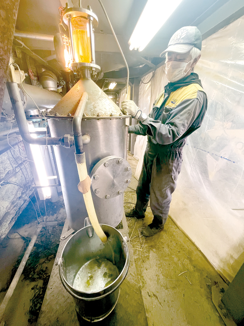 抽出された油は淡い黄金色よりもやや緑がかって見えた。水が混じらぬように手作業で一斗缶へと注ぎ、ろ過作業を経て出荷される。組合全体では例年だと約380㌔の油が採取できるそうで、平川さんは「今年は雨が少なく、暑かったが、それが適度な刺激となったのか生育はよく、油の出方もまずまず」と手応えを語った。