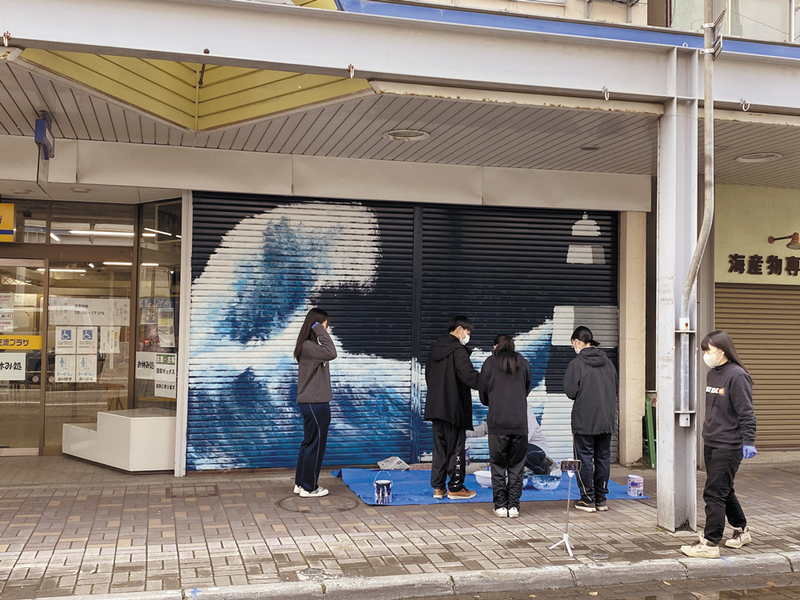 シャッターアートのデザインなどを担った向瑞希さんは「オホーツク海のくすんだ色や荒れる波のしぶきなどをうまく表現したい。このシャッターアートを見た人が『商店街にまた来よう』と思ってくれたら」と話していた。 (大)