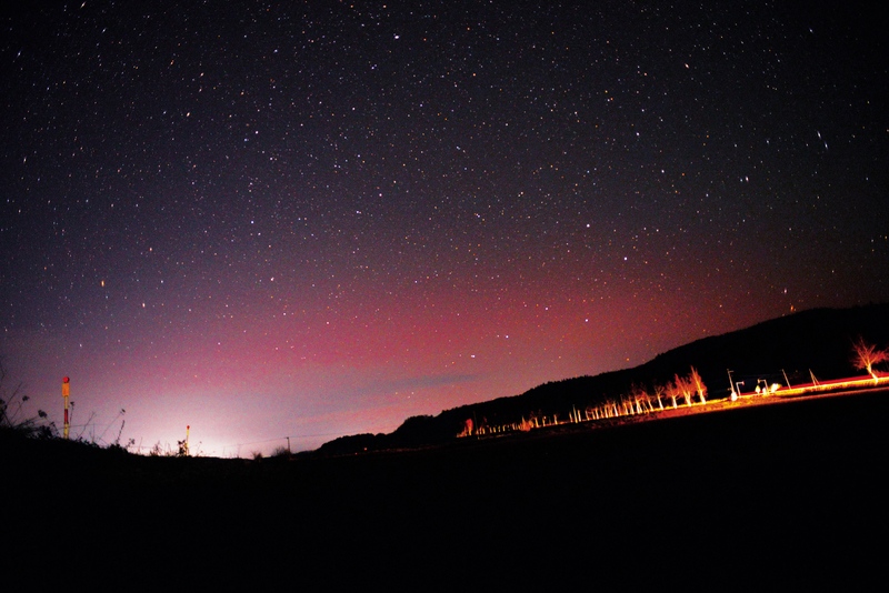 市街地と美幌峠の間にある古梅の国道243号に沿う農道から、15秒間シャッターを開けて撮影。市街地の明かりと、国道を走る車が照らすシラカバ並木の上空が赤く染まっていた。 (浩)(理)