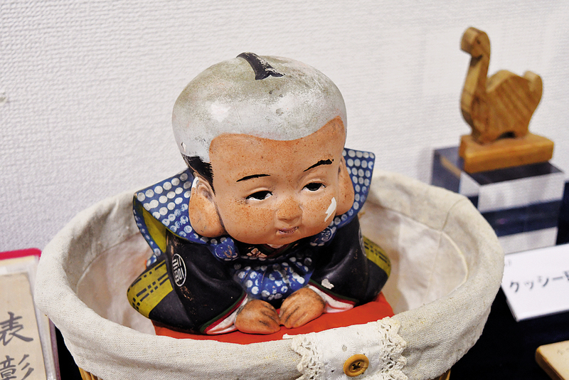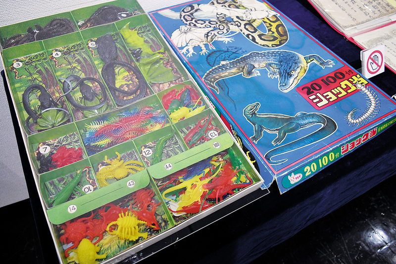 おもちゃ、食器、楽器、キーホルダーなど36種、380点の資料を紹介。昭和に見られたムカデ、ヘビなど昆虫やは虫類のおもちゃが当たるくじ「ショック当」、〝昭和の歌姫〟美空ひばりさんのコンサートや人気ドラマ「名犬ラッシー」が収録された市販の8㍉フィルムと映写機など、なつかしい品が並ぶ。
