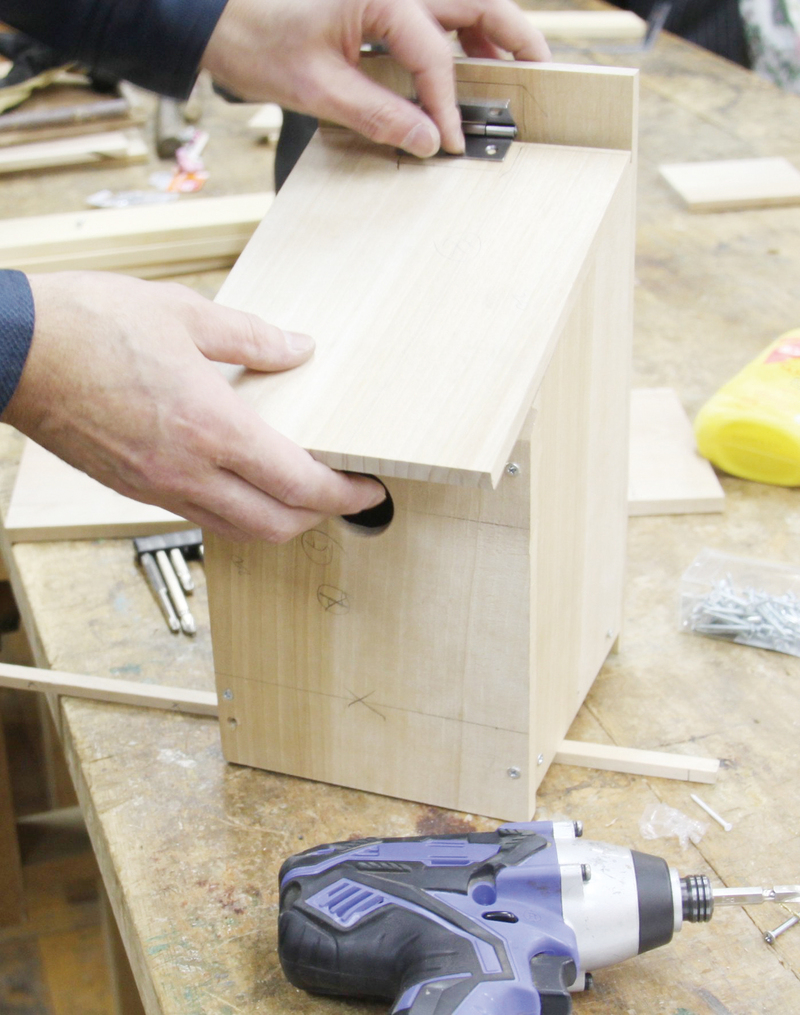 事前に図面をおこし参加した男性町民は巣箱を作成。木工室にある指金(角定規)やドリルを器用に利用し、完成をめざして熱中していた。