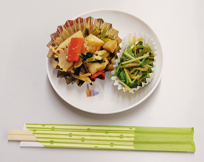 最後に食物繊維がしっかり摂れる「切干大根と水菜のごまサラダ」と、大豆製品をメインにした「厚揚げと野菜のみそ炒め」の試食が行われた(写真左)。