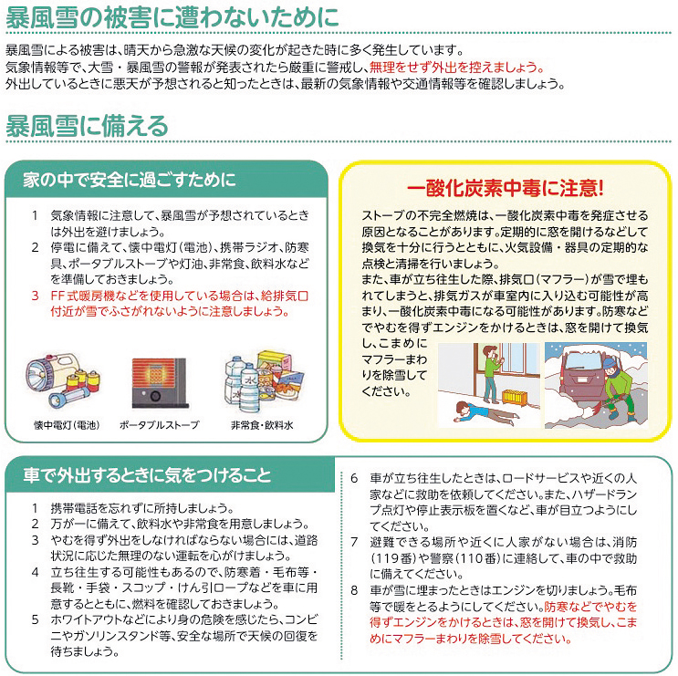 外出するときは気象情報を確認し、暴風雪の予報が出ている場合は、できるだけ外出を控えるのが望ましい。次回は「暴風雪編・備蓄品」を紹介する予定だ。(知)