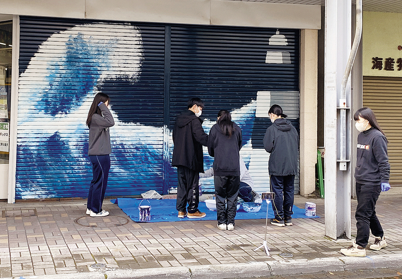 3年生グループの9人が制作。授業「総合探求授業」の一環として、地元商店街の活性化を目的に今年7月から準備を進め、学校が休みの土・日曜を中心に集まり、筆を運んだ。