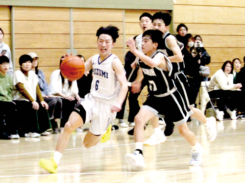 1㍍66の三浦主将が再三にわたり切り込み(写真右)、4つのファールをもらいながらも体を張って躍動。1㍍59の大町空選手(同1年)がスチールや3ポイントシュートで活躍し、2人でチームの約3分の2を得点し60—55で勝利した。