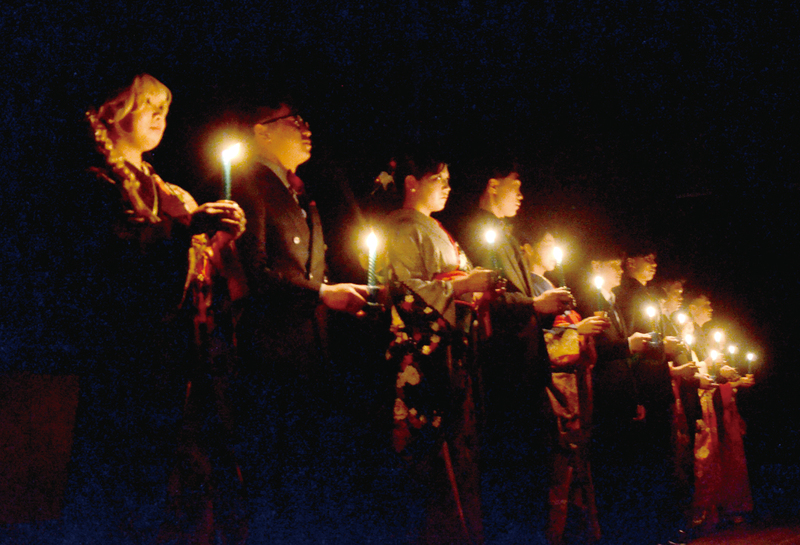 キャンドルサービス(写真右)の後、小田桐瑞王さんと松浦翔來さんが「自らの行動に責任を持ち、郷土を愛し、北見市のまちづくりのために努力します」などと誓いの言葉を述べた。会場には艶やかな振り袖姿も多く見られ、華やかな雰囲気に包まれていた。 (柏)