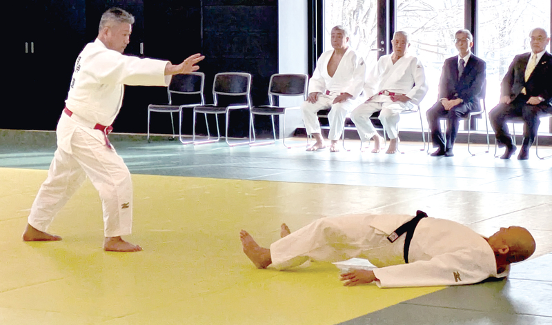 昨年、全日本柔道形競技大会に出場した中澤会長と新海敬一さんのペアが形の演武を披露(写真左)。続く初稽古では、選手達が真剣な表情で乱取りに励んでいた。 (柏)