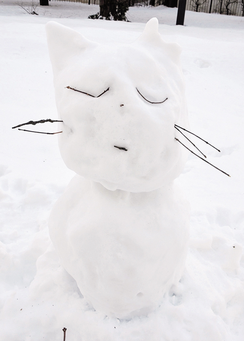 年明け間もない北見の石北大通。まるでデコボコしたスケートリンクのような細い遊歩道を行く。北4条通りから北3条通りへ向かう途中、猫の雪像に出会った。とぼけたような表情にホッコリ。思いがけない出会いに、笑顔がこぼれる。