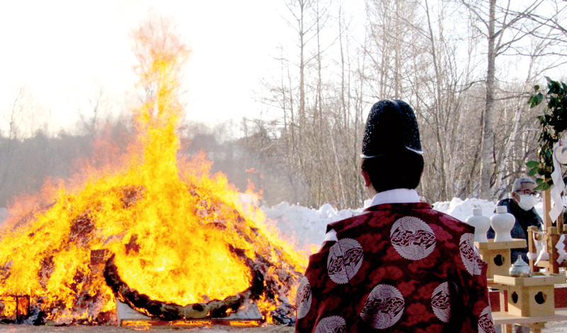 小正月の15日、各地で伝統のどんど焼きが行われた。北見神社の会場では市民が燃えさかる火に手をかざし、今年の健康を祈った。