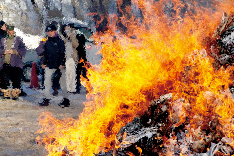 風もなく穏やかな朝で火は例年より勢いよく立ち上った。来場者は「今年も穏やかな1年でありますように」とか「火の勢いのように今年1年元気で過ごせますように」などと静かに手を合わせていた(同下)。 (寒)