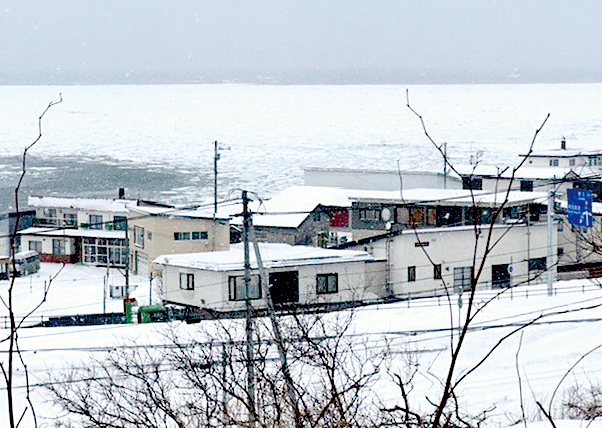 北見市常呂の前浜に28日、流氷が到達した。前日、沖合に見えていた白い筋状の氷が一夜にして岸まで押し寄せた。冬の使者到来の様子を㈱伝書鳩社員が撮影した。