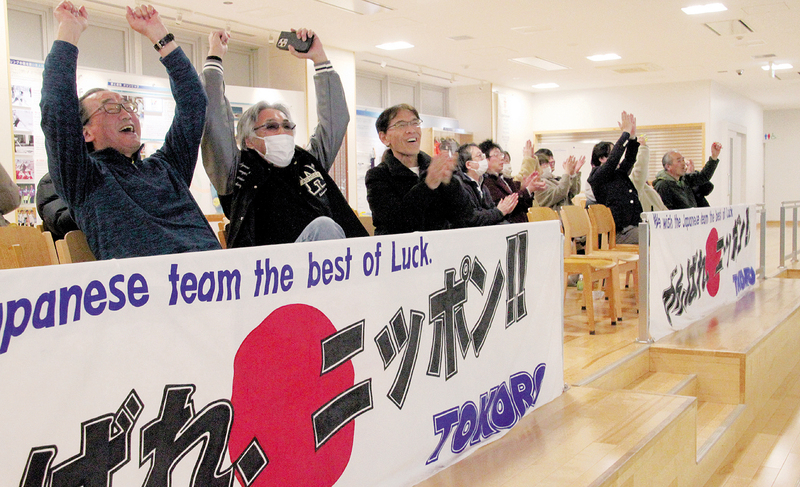 ここまで0勝2敗の日本は、世界ランク2位の強豪スイスと対戦。試合の中盤以降、優勢になり7―5で勝利した。同じく常呂出身者らでつくるロコ・ソラーレの鈴木夕湖選手の両親も応援し「あのスイスに勝った」ともろ手を挙げて喜んだ。