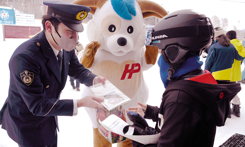 同日、スキー場で開かれた美幌町リリー山選手権大会に合わせて実施。署員と道警シンボルマスコットのほくとくんが、出場選手や選手の応援者、一般来場者、大会関係者らにパンフレットなどを手渡した。