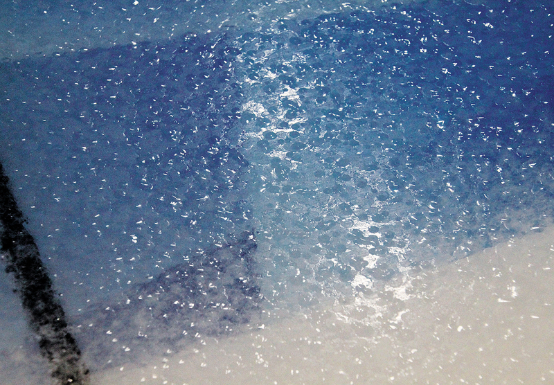 「お湯のほうが表面でゆっくりと凍り、水よりも平らな凸面になる」そう。さらにこの表面を削って、ぺブルの山の標高を揃える。「多く削ると曲がり幅が大きくなる。でも削り過ぎてもだめ」