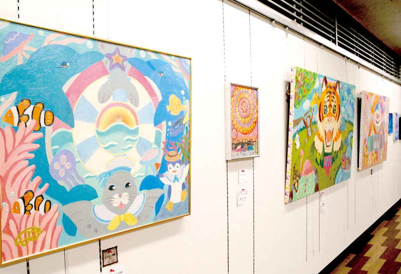 油彩、水彩、色鉛筆やマーカーなど、さまざまな画材を使用。独特の色使いで動物達をかわいらしく表現した100号の油彩画「あさひやまZOO」、ナイフだけで描いた「若松大橋」やコラージュ、立体絵画といった作品も。今回は、それぞれの作品に作者のコメントもつけて展示した。