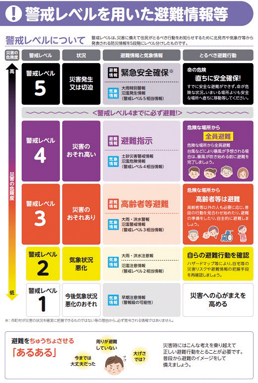 北見市や気象庁などは、災害時に防災情報を警戒レベル1から5に区分して発表している。