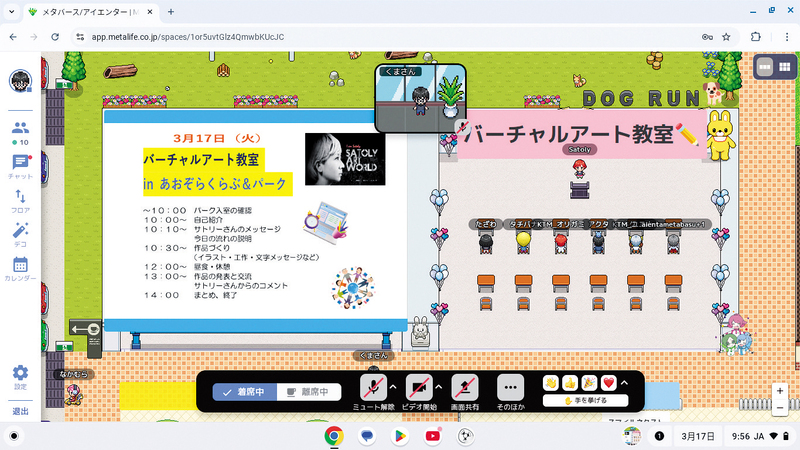 アバターで集まり、絵を描いて交流―。北見市教育委員会は17日、メタバース(仮想空間)上で不登校の児童・生徒の居場所として開放している「あおぞらパーク」でバーチャルアート教室を開いた。小学4年生から中学2年生までの9人がオンラインで参加し、アーティストと交流しながら創作を楽しんだ。