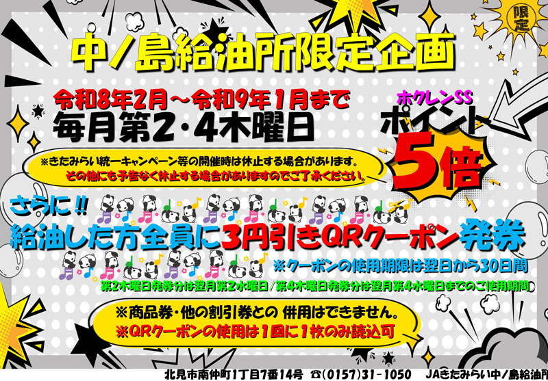 2月の第2・4木曜日の2月12日と2月26日は、ホクレンSSポイント5倍キャンペーンを実施致します!